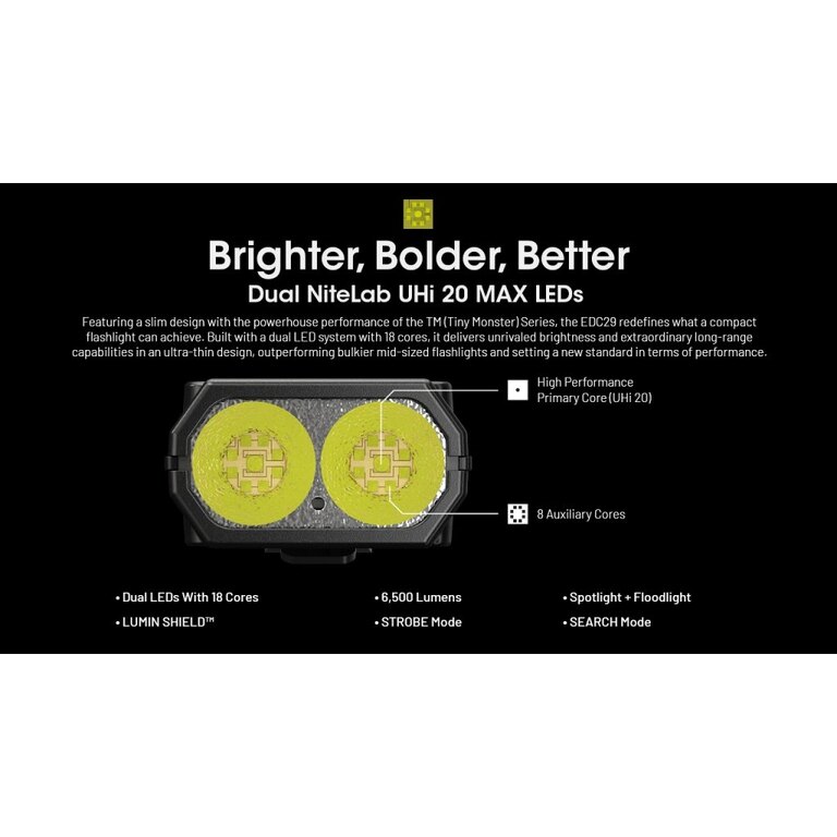 S maximálnym výkonom 6500 lúmenov je Nitecore EDC29 ideálne pre tých, ktorí potrebujú intenzívne svetlo na dosah ruky. Bez ohľadu na to, či preskúmavate tmavé chodníky, pracujete vonku alebo len hľadáte spadnutý predmet, toto svietidlo zabezpečí špičkovú viditeľnosť.