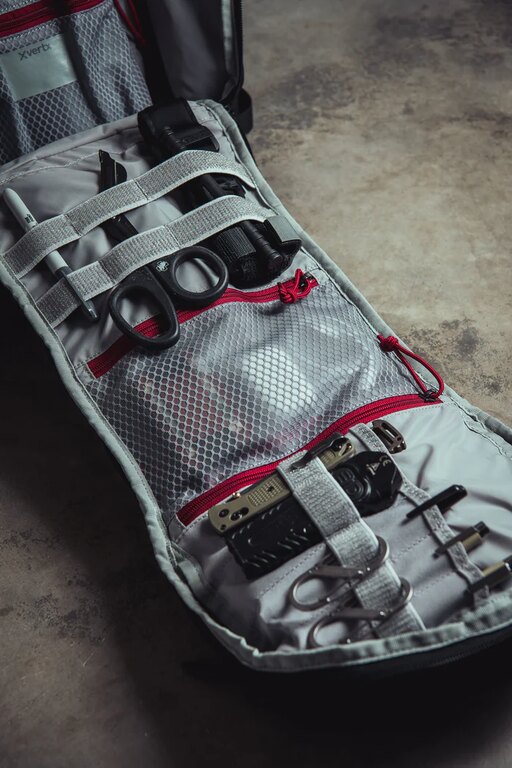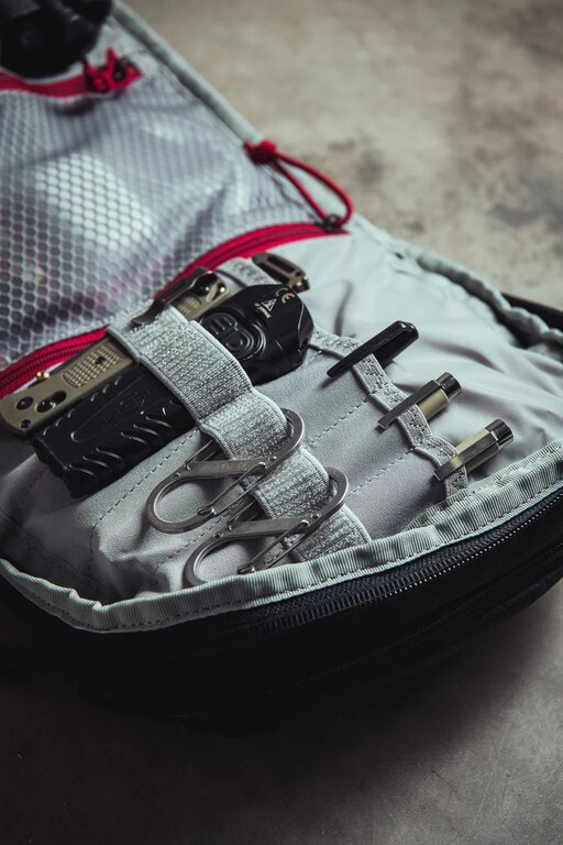 Svetlý interiér zlepšuje orientáciu aj v horších svetelných podmienkach. Sieťované vrecká, sloty na výbavu, suché zipsy a kotviace body držia obsah pod kontrolou. Predné admin vrecko ponúkne sloty na zásobníky alebo lekárničku a elastické úchyty pre modulárne doplnky. Dvojvrstvová tech priehradka ochráni notebook väčších rozmerov aj ďalšie zariadenia. Navyše bočné vrecko s organizáciou dáva priestor na fľaše, hydratáciu alebo ďalšie vybavenie, ktoré chcete mať prehľadne po ruke. Samostatné horné vrecko s trikot podšívkou dáva priestor pre okuliare a drobnosti prístupné bez otvárania hlavnej komory.