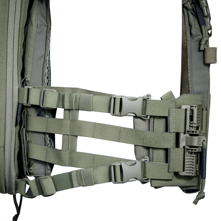 Batoh Modular Chest Rig od Tasmanian Tiger rozširuje možnosti chest rigu a nosiča plátov o zadný úložný priestor bez nutnosti klasického batohu. Ide o nadstavbu, ktorá sa pripája k nosnému systému a rozširuje jeho funkčnosť. Umožňuje mať výstroj rozložený priamo na tele, prehľadne usporiadaný a okamžite dostupný. Navyše umožňuje vloženie balistického plátu a rozšíriť tak ochranu chrbta podľa konkrétnej konfigurácie. Chest rig nie je súčasťou balenia.