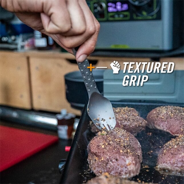 Vidlička má predĺžené hroty s rozostavením, ktoré pomáhajú pri naberaní mäsa, cestovín alebo jedla priamo z kotlíka. V praxi to znamená pohodlné jedenie bez krútenia zápästia a bez pocitu, že človek drží len náhradu plnohodnotného príboru. V kombinácii s pomocným nástrojom tvorí stabilný celok, ktorý môžete mať vždy po ruke.