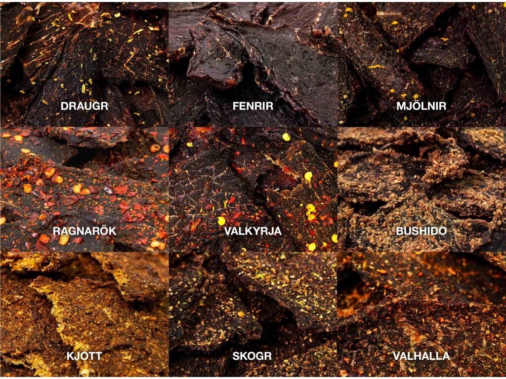 | Súčasťou dodávky | Degustačný výber sušeného mäsa s rôznymi príchuťami (box obsahuje všetky aktuálne príchute Berserkr) |