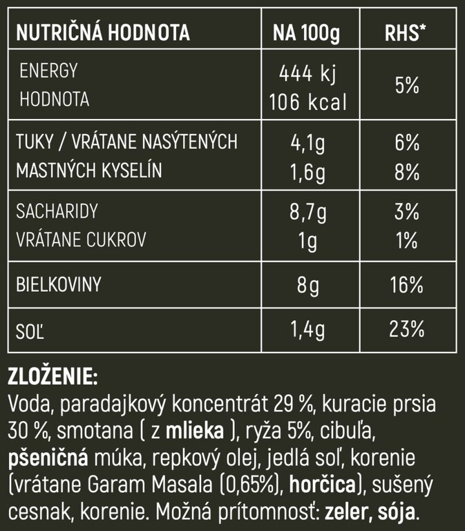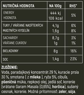 Chicken Masala je sýte a výživné jedlo, ktoré doplní sily aj v náročných podmienkach. Vďaka dlhej trvanlivosti je vhodné do auta, do batoha aj do dielne – jednoducho všade tam, kde nie je čas ani miesto na klasické varenie.