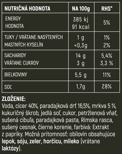 Cícer ako hlavná surovina dodáva prirodzený zdroj bielkovín a vlákniny, ktoré udržia telo v tempe po celý deň. Zelenina pridáva vitamíny a minerály, omáčka zasa plnú chuť a vôňu, ktorá sa nestratí ani po ohreve. Výsledkom je sýta kombinácia, ktorá zasýti, ale nezaťaží.