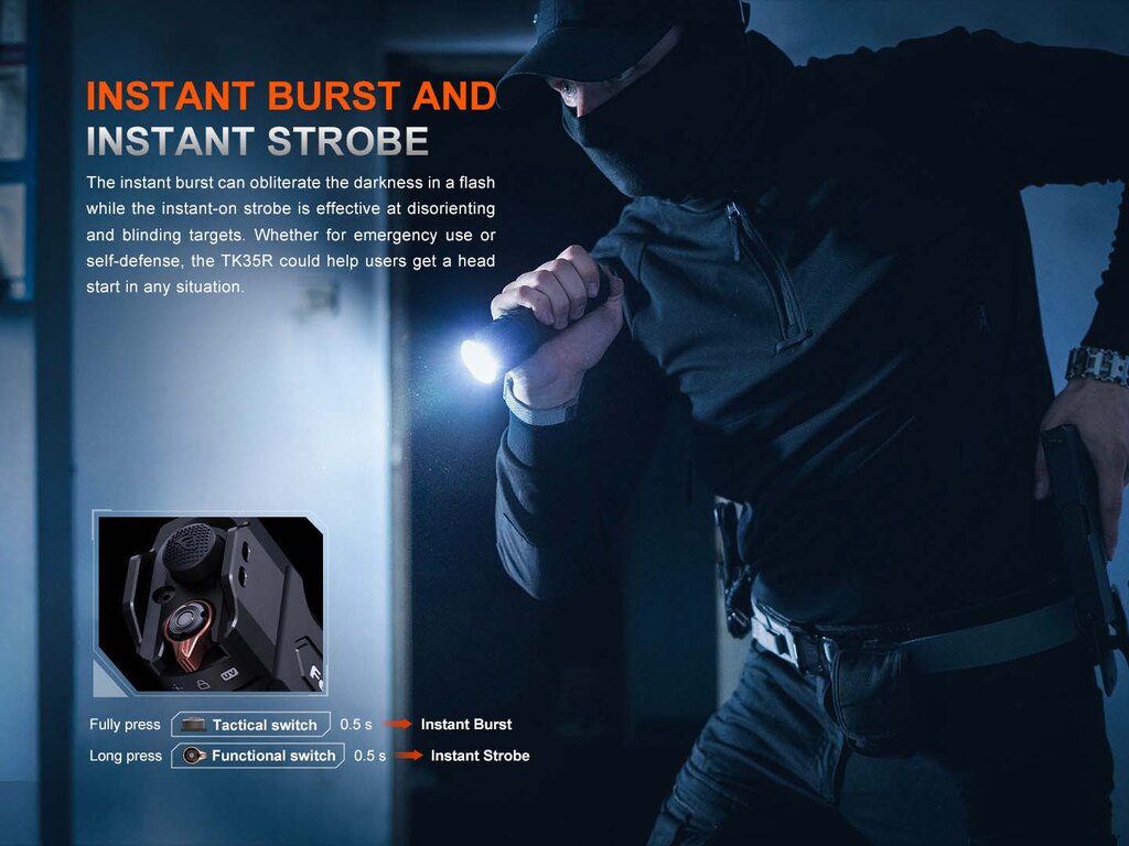 Taktický spínač na konci zabezpečuje okamžitú reakciu a rýchle použitie stroboskopu. Vedľajšie tlačidlo slúži na prepínanie medzi úrovňami výkonu. TK35R si pamätá posledný nastavený režim a pri každom zapnutí nadviaže tam, kde skončilo. Indikácia stavu batérie navyše hneď po spustení ukáže, ako je na tom energia.
