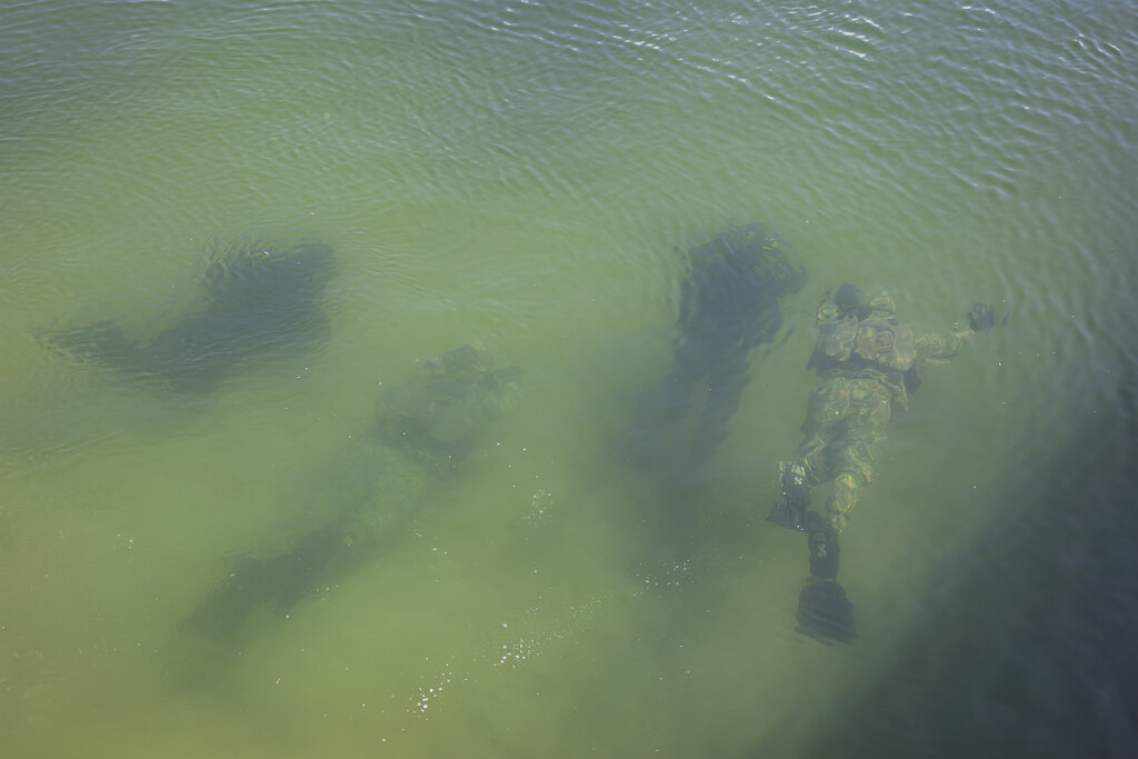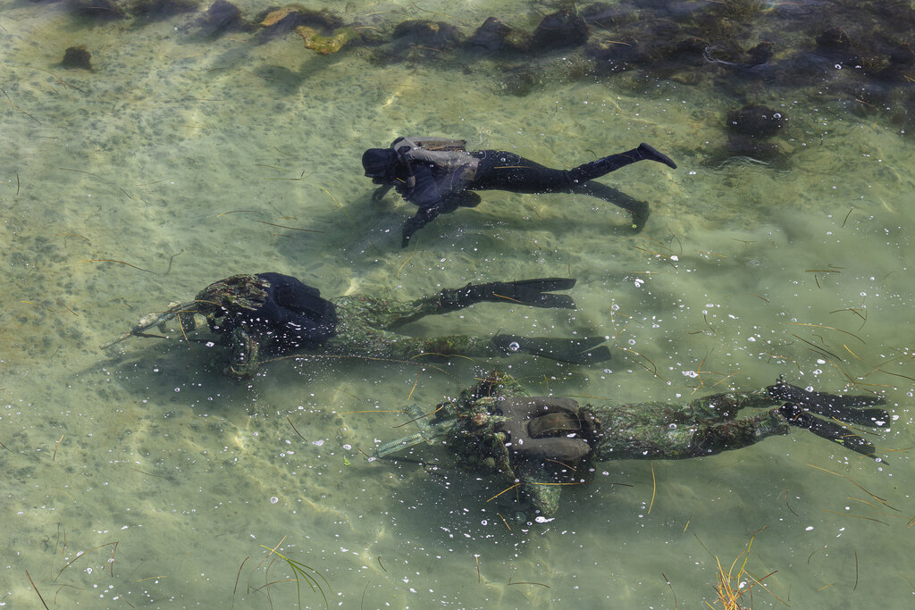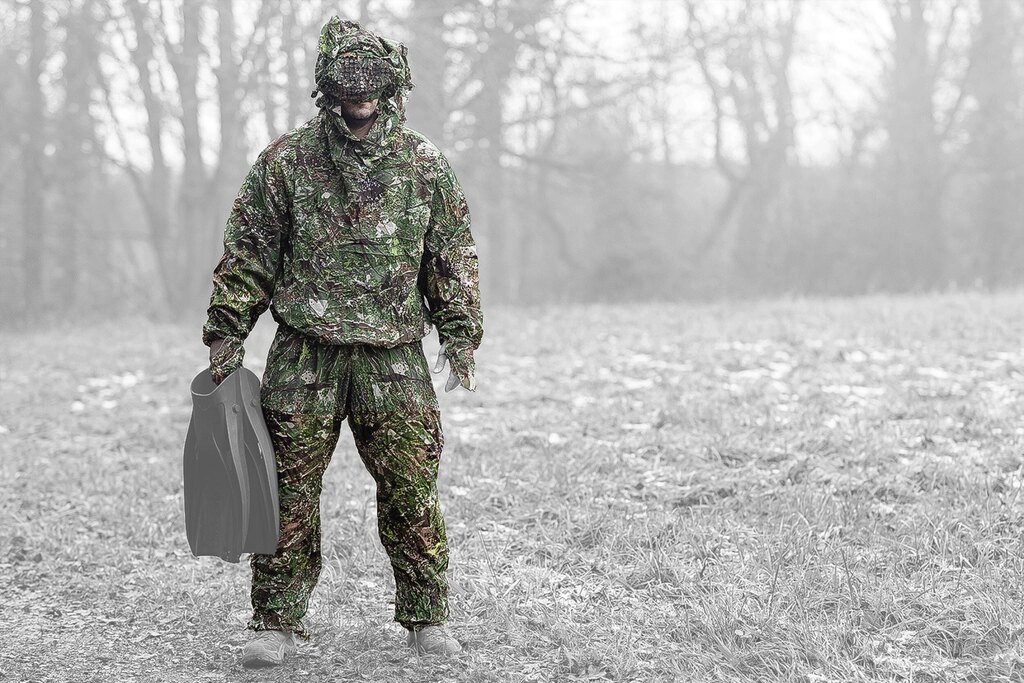 Maskovací oblek DIVER CAMO má výstuž Cordura na lakťoch aj kolenách aj kamufláž pre chrbty rúk. Dodáva sa vrátane krytu potápačskej masky. Oblek sa používa cez mokré aj suché oblečenie.