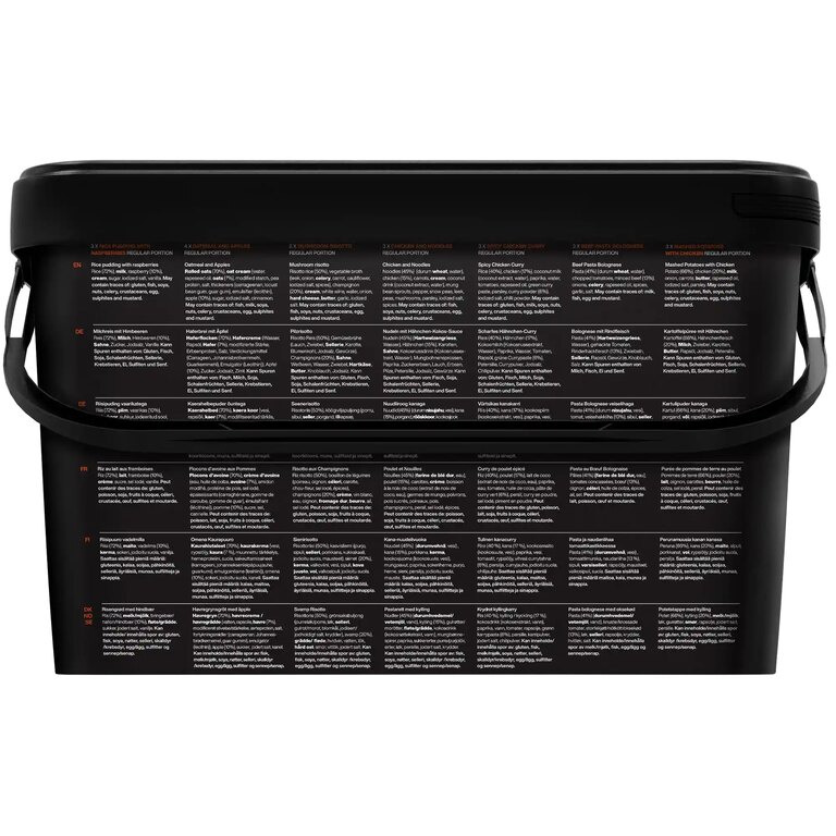 | Súčasťou dodávky | Balené vo vodotesnej nádobe Celkom 21 jedál 4× Ovsená kaša s jablkami 3× Ryžový puding s malinami 2× Hubové rizoto 3× Hovädzie cestoviny Bolognese 3× Zemiaková kaša s kuracím mäsom 3× Kurča s rezancami 3× Pikantné kuracie na kari |
