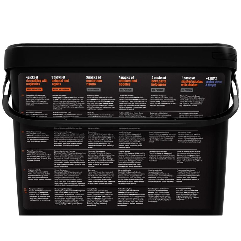 | Súčasťou dodávky | Balené vo vodotesnej nádobe Celkom 21 jedál 4× Ryžový puding s malinami 3× Ovsená kaša s jablkami 3× Hubové rizoto 4× Kurča s rezancami 3× Zemiaková kaša s kuracím mäsom 4× Hovädzie cestoviny Bolognese 2× ohrievač jedla (Tactical Fire Pot) 7× jednorazová outdoorová sprcha |