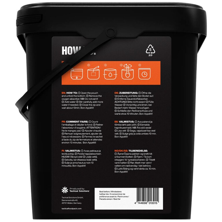 | Ďalšie špecifikácie | Veľké balenie - lacnejšie ako kupovať každé jedlo zvlášť Mrazom sušené jedlo s vysokým obsahom energie GMO free Bez palmového oleja a škrobu Pripravené z prírodných surovín, bez konzervantov Bez "chémie" a nepotrených prísad Naozajstná chuť Dlhá životnosť pri skladovaní - až 8 rokov od dátumu výroby Skladovacia teplota: 10 °C až 30 °C Vyrobené v Nemecku Schválené a overené NATO Nato stock number (NSN): 8970-38-001-5443 Každé jedlo balené v znovu uzatvárateľnom balení Jednoduchá príprava - otvoríte sáčok, zalejete horúcou vodou, zamiešate a znovu uzavrite Pred zaliatím vodou odstráňte pohlcovač kyslíka! Potrebné množstvo vody uvedené na sáčku (od 150 ml) Doba čakania po zaliatí: uvedená na sáčku (5 min až 10 min) Možnosť prípravy aj so studenou vodou (dlhšie čakanie, studené jedlo) |