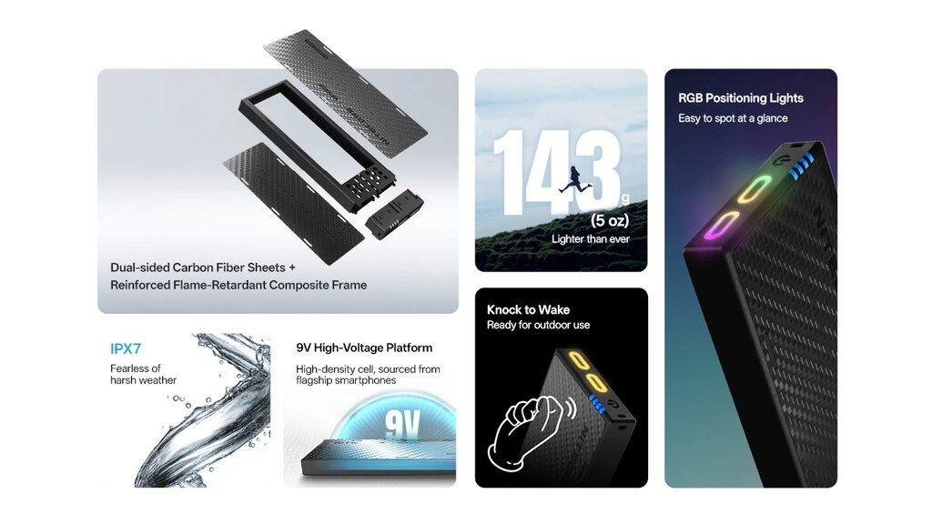 NB10000 Gen4 je vybavená funkciou Knock to Wake, ktorá umožňuje prebudiť zariadenie poklepaním. RGB pozičné svetlá uľahčujú orientáciu v tme. Súčasťou balenia je kábel s pútkom, ktorý slúži ako na nabíjanie, tak na uchytenie powerbanky.