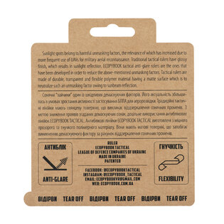 Toto taktické pravítko nebude bojkotovať vaše premyslené maskovanie, pretože skrátka neodráža slnečné svetlo. To sa hodí nielen vtedy, keď potrebujete svoje pozície utajiť pred nepriateľom, ale súčasne aj vtedy, keď pri svojich dôležitých úlohách nechcete byť oslnení slnkom. Materiál, z ktorého je toto pravítko vyrobené, je navyše priehľadný a pružný.
