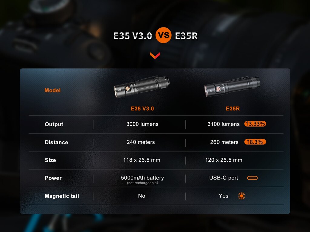 Fenix E35R je nabíjacie vreckové svietidlo s nadštandardným svetelným tokom aj vysokým dosvitom. Hodí sa ako na profesionálne použitie – napríklad pre členov bezpečnostných agentúr alebo strážcov – tak pre nadšencov do outdoorových aktivít a športovcov, ktorí sa vonku pohybujú v noci. Rovnako tak však môže ísť aj o nadštandardné svietidlo do dielne.