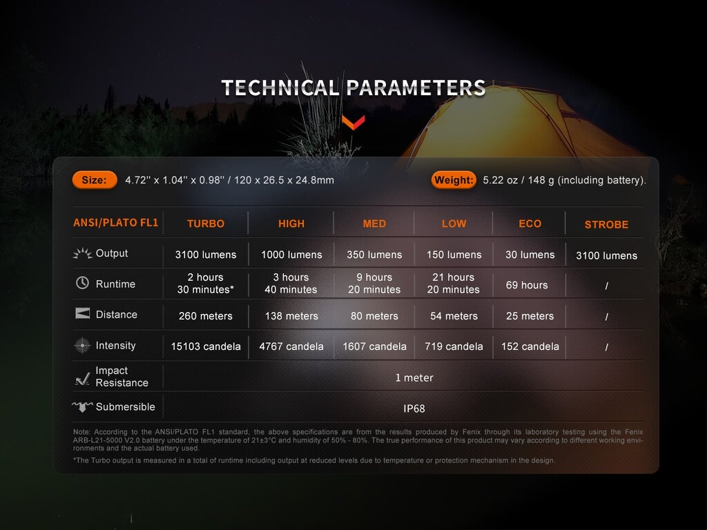 | Typ batérií / akumulátora | Nabíjací Li-ion akumulátor Fenix® ARB-L21-5000 V2.0 (21700 5 000 mAh) |