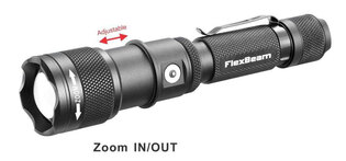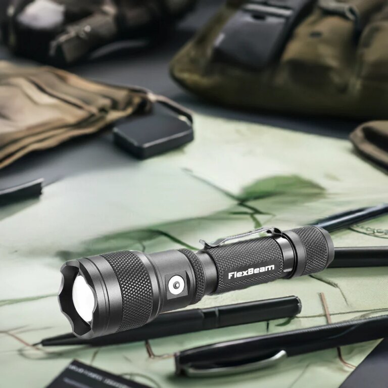 FlexBeam umožňuje plynulé prepínanie medzi širokým rozptýleným svetlom na prácu na blízko a úzkym bodovým lúčom na presné osvetlenie na väčšiu vzdialenosť. Výkon 1200 lúmenov a optimalizovaná optika zabezpečujú jasnú viditeľnosť pri kontrole výstroja, orientácii v teréne aj pri technických úkonoch v tme.