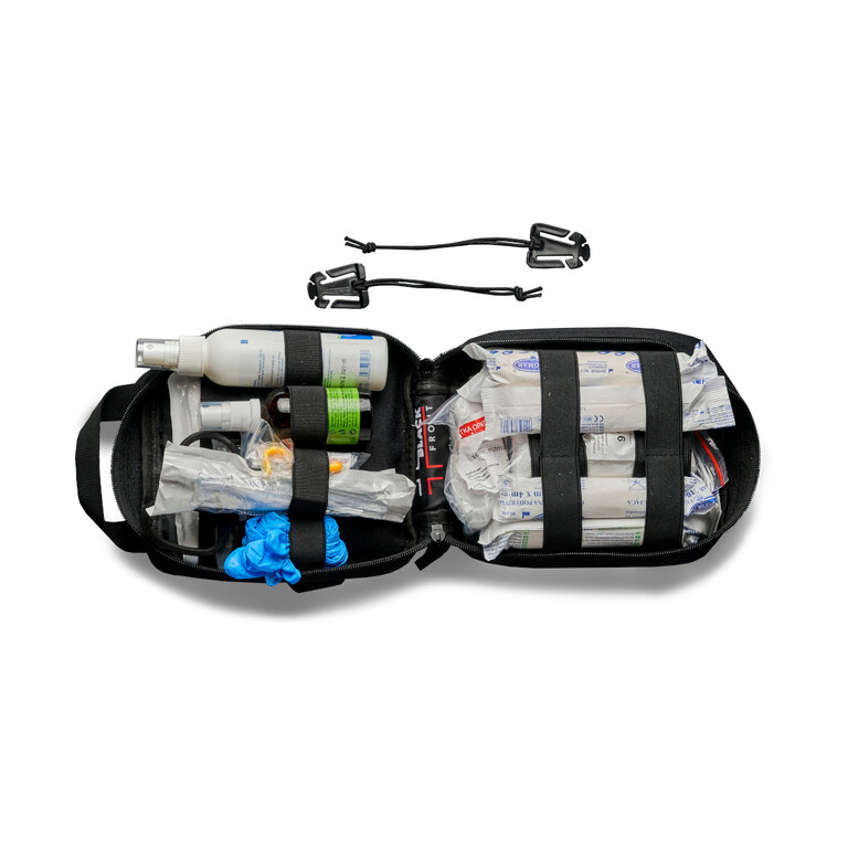 Vo vnútri nájdete sieťované vrecká a gumové úchyty, ktoré umožňujú presné rozvrhnutie obsahu. Vďaka tomu okamžite viete, kde čo je – a hlavne sa k tomu dostanete jednou rukou. V krízovej chvíli tak šetríte čas aj nervy.
